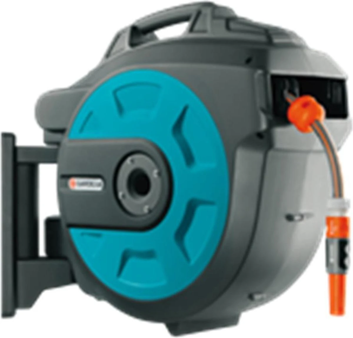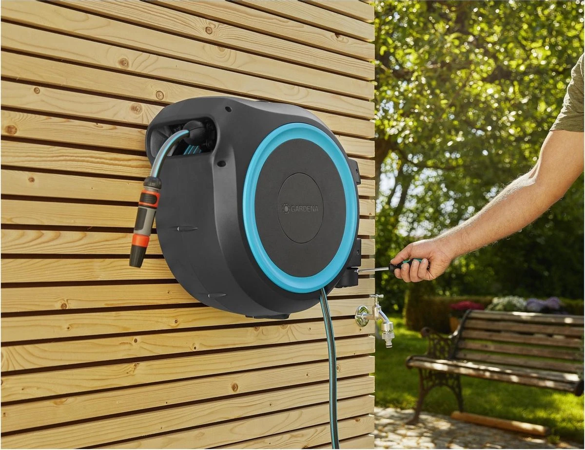 - Dankzij de wandslangenbox heeft u de tuinslang en accessoires altijd bij de hand. Sproeiers, tuinspuiten en wasborstels kunnen eenvoudig aan de muurbeugel worden opgehangen en opgeborgen.